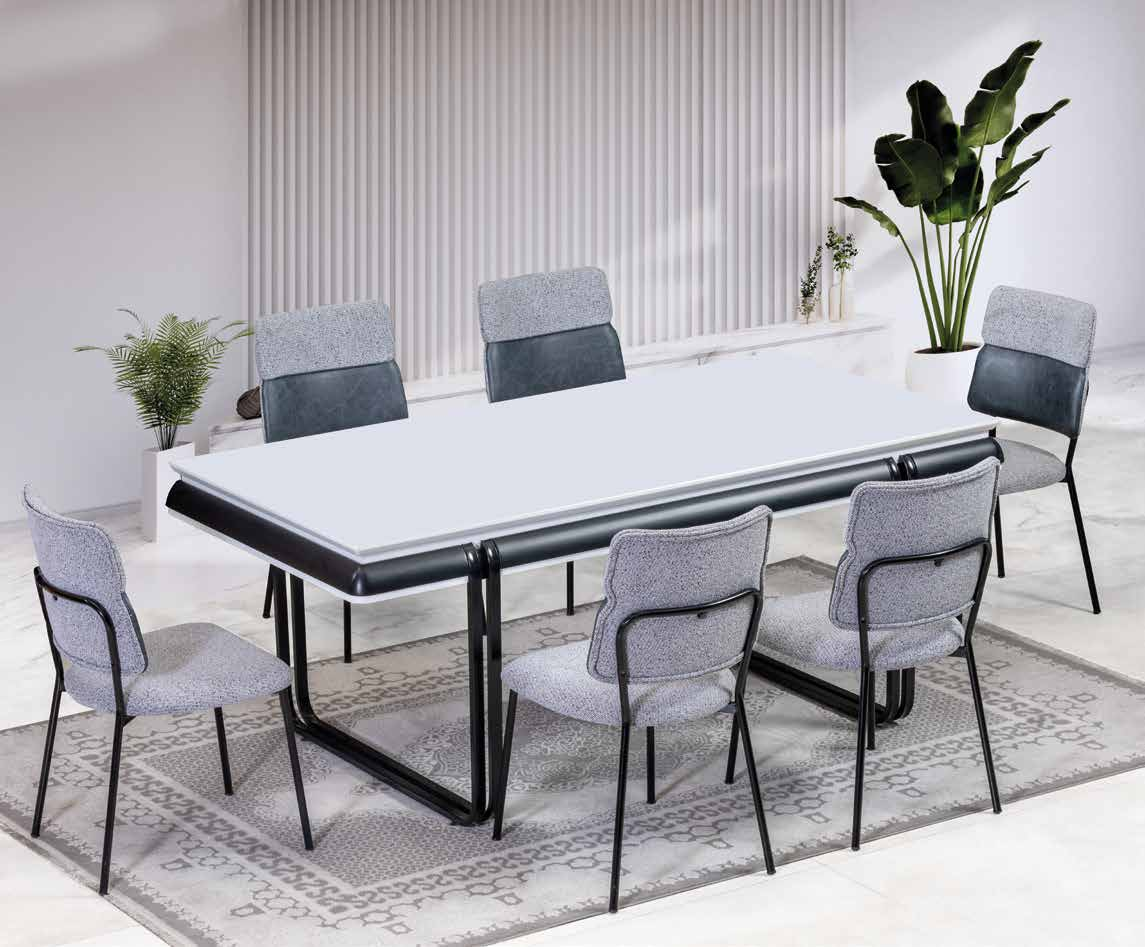 Ein moderner Stuhl mit verchromtem Gestell, der zeitlosen Stil und hohen Komfort bietet. Ergänzt wird er durch einen Tisch mit einer schwarzen Tischplatte und einem verchromten Rahmen. Diese Kombination ist ideal für elegante und funktionale Innenräume.